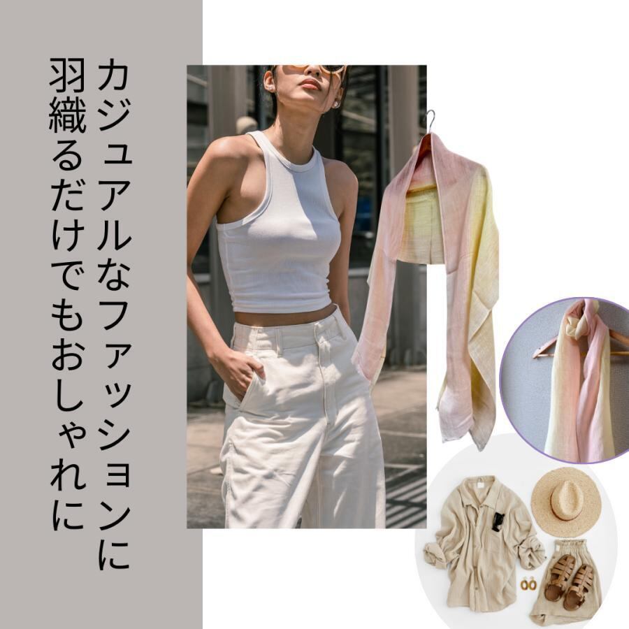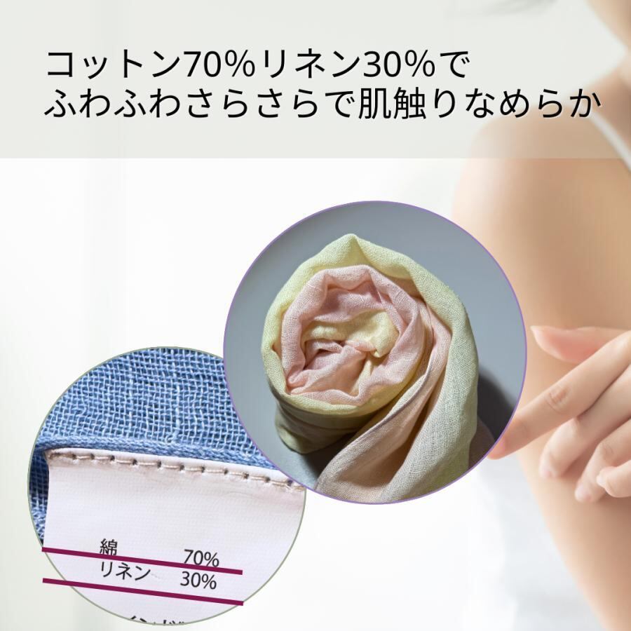 コットンの肌馴染みとリネンの張りによる高級感、グラデーションカラーが様々なファッショに馴染み易いデザイン面の調和性、さらに、コットンの吸収性&リネンの通気性など機能性を兼ねた、活躍機会豊富なストール