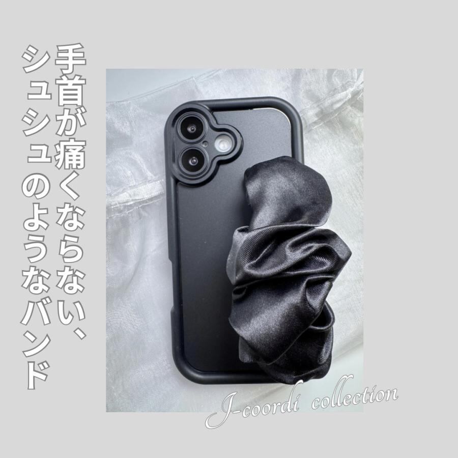 -シックな黒のケースに、シュシュのような柔らかゴム素材のリストバンドを装備。腕に装着できるので、スマホを持ちながら両手を自由に使えます。
